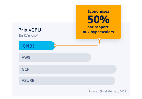 Le Cloud IONOS est une infrastructure digitale puissante, qui offre aux entreprises un environnement flexible et sécurisé pour exécuter et gérer leurs applications et leurs données dans le Cloud. Il permet une flexibilité élevée ainsi qu'une grande évolutivité et s’adapte précisément aux besoins spécifiques de votre entreprise.